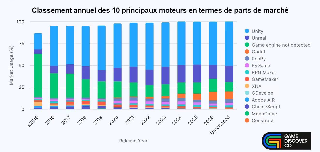 Autre tendance notable : le recul des moteurs propriétaires. La part des jeux développés sans moteur identifié est passée de 27 % en 2017 à 13 % en 2025, signe que les solutions existantes sont désormais suffisamment accessibles et complètes pour répondre à la majorité des besoins.